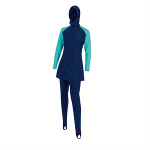 Flot og smart burkini, der dækker hele kroppen og har smarte stropper forneden, så buksebenene holdes på plads. Burkinien er 3-delt og har løs hætte, så håret ligeledes kan dækkes til , hvis dette ønskes.